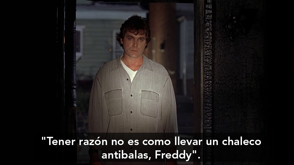 «Tener razón no es como llevar un chaleco antibalas, Freddy«. Personaje/Actor de doblaje: Figgis (Manolo García) [EN VERSIÓN ORIGINAL]: – «Bein’ right is not a bulletproof vest, Freddy!. « Gary (Figgsy) Figgis (Ray Liotta) en Cop Land Tierra de policías (Título Hispanoamérica) TRÁILER VOSE COP LAND (James Mangold, 1997)