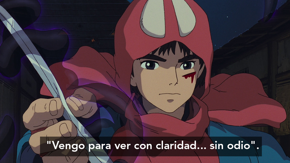 – ¿Cuáles son tus intenciones?¿Para qué has venido hasta aquí? – Vengo para ver con claridad… sin odio. Personaje/Actor de doblaje: Príncipe Ashitaka (David Robles) [EN VERSIÓN ORIGINAL]: – 曇り無きまなこで見定め、決める (Kumori naki manako de misadame, kimeru.) Príncipe Ashitaka (Yoji Matsuda) en もののけ姫 (Mononoke-Hime) TRÁILER VOSE La princesa Mononoke (Hayao Miyazaki, 1997)